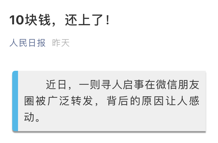 《人民日報》官微推送了《10塊錢,還上了》的消息,并配發“從青島到深圳,近兩千公里的距離,耗時兩天半,10塊錢終于還上了,這不僅圓了他們的心愿,還打動了很多人”的短評。該條推送短時間閱讀量就達到“10萬+”。