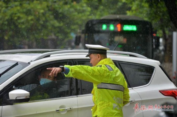 上午10時許,受降雨和就醫車輛的增多,江蘇路青島大學附屬醫院門前成為堵點,市南交警大隊中山路中隊增派警力疏導交通。記者在江蘇路和龍口路交叉口看到,共有7名交警冒雨值勤。市南交警大隊中山路中隊中隊長劉清泉剛從大隊開完會,身著執勤服,來不及回中隊拿雨衣便出現在馬路上指揮交通。雨水很快將劉清泉打濕,不少群眾見此景主動為劉清泉打傘。
