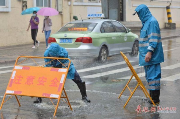 降水使島城多處低洼地帶出現積水,青島水務集團排水公司緊急出動,對雨水箅子等排水設施進行淤堵清理,并派人在積水點進行守護。圖為記者在濟南路和山西路路口看到,排水工人在井口設置警示標志,并根據積水情況,打開、關閉井蓋,避免發生危險。