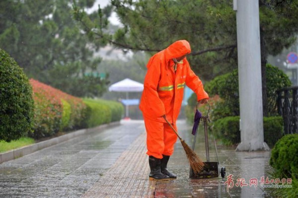 風雨天,垃圾比平時更多也更難消除,他們細心打掃,守護城市美麗。在青島火車站,兩名環衛工用掃帚驅趕積水;在太平路,一名環衛工在雨中清掃人行道上的落葉和垃圾……我們不知道他們的名字,但是他們的付出呵護著城市的環境。